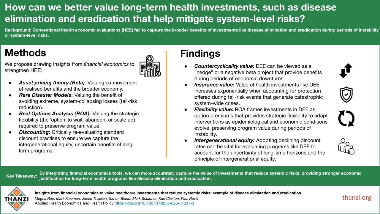 Headline: Insights from financial economics to value healthcare investments that reduce systemic risks: example of disease elimination and eradication. Overview: This visual abstract outlines how tools from financial economics can better value long-term health investments like disease elimination and eradication (DEE), which conventional evaluations often undervalue. Core Content: The Problem: Conventional health economic evaluations (HEE) fail to capture the broad benefits of DEE during periods of system-level risk or instability. Proposed Methods: The authors suggest drawing from four financial economics concepts: Asset Pricing Theory (Beta): Valuing how realized benefits move in relation to the broader economy. Rare Disaster Models: Valuing the avoidance of extreme, system-collapsing "tail-risk" losses. Real Options Analysis (ROA): Valuing strategic flexibility to wait, abandon, or scale programs to preserve value. Discounting: Re-evaluating discount practices to account for intergenerational equity and long-term uncertainty. Key Findings:Countercyclicality Value: DEE acts as a "hedge" (negative beta) by providing benefits during economic downturns. Insurance Value: The value of health investments increases exponentially when protecting against catastrophic, system-wide crises. Flexibility Value: ROA treats DEE investments as "option premiums" that allow programs to adapt as conditions evolve. Intergenerational Equity: Declining discount rates help account for long-time horizons and fairness to future generations. Key Takeaway: Integrating these financial tools provides a stronger economic justification for long-term health programs by more accurately capturing their value in reducing systemic risks.